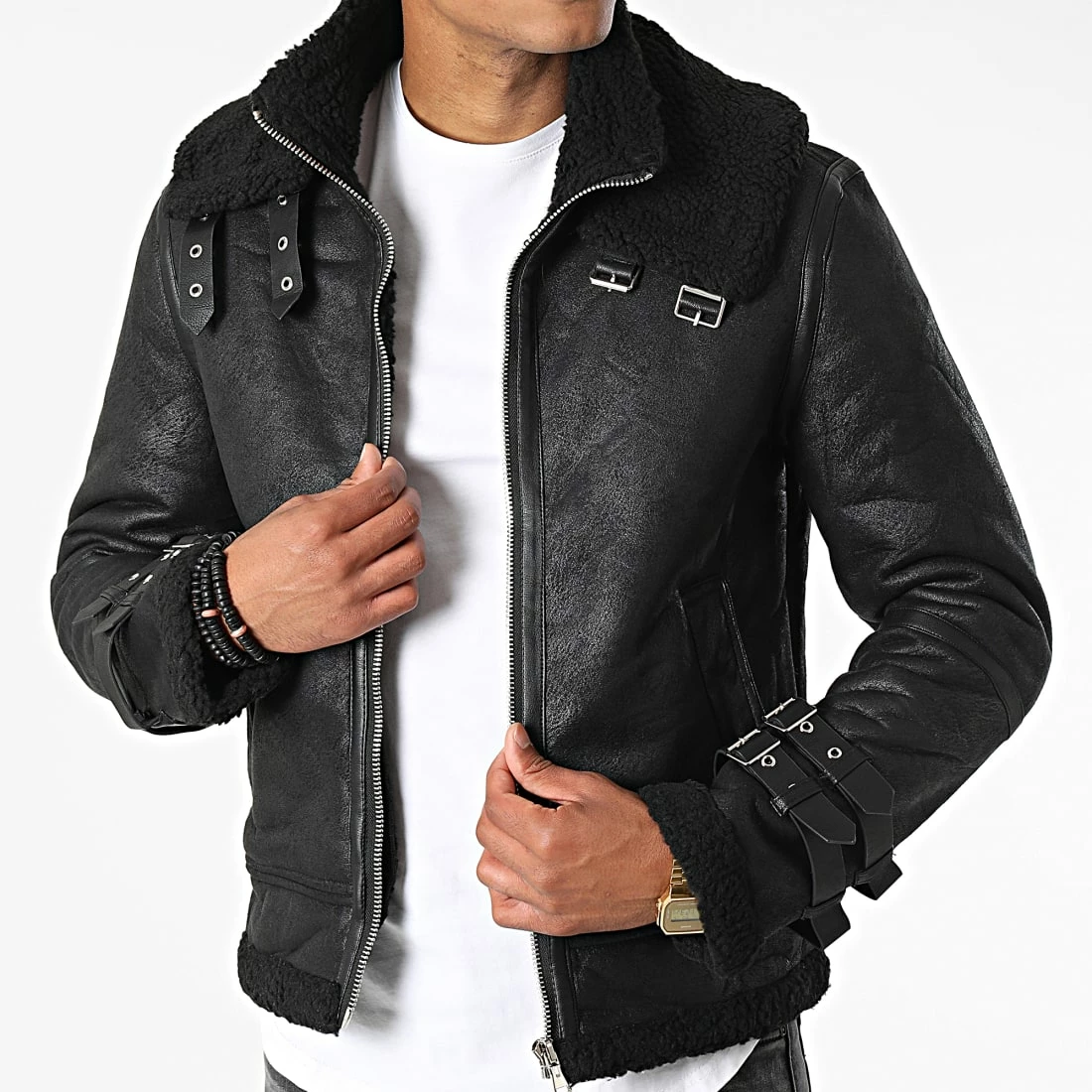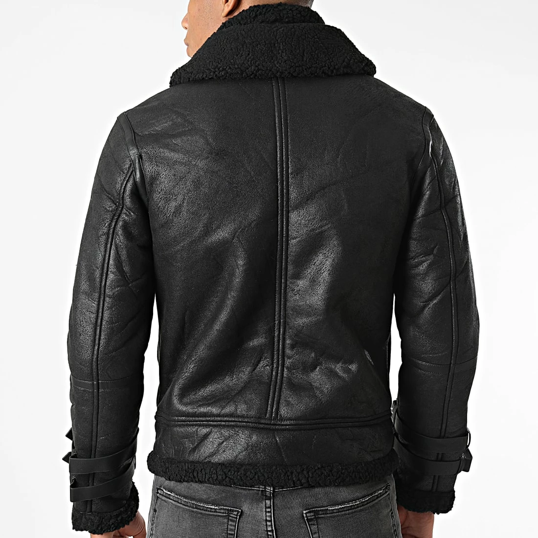 • Veste bombardier aspect cuir retourné avec col mouton